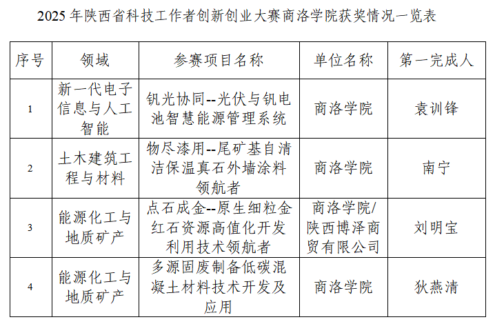 商洛学院4项科技成果获得2025年陕西省科技工作者创新创业大赛三等奖