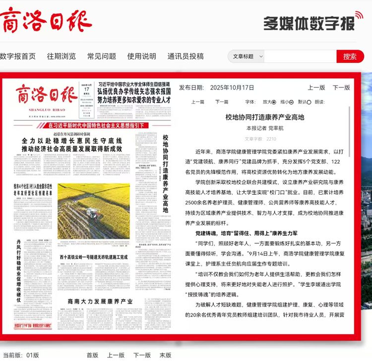 据了解,针对产业需求,健康管理学院党员教学骨干牵头开设“康养产业管理”微专业,课程直指秦岭康养资源开发、健康产品营销等实际问题;搭建“红色导师工作室”,成立“创想先锋”临时党支部,指导学生完成的《社区养老服务现状报告》被民政部门采纳。校企还共建康养产业联合研究中心,让学生在“产研学”实践中成长,实现“毕业即上岗、上岗可胜任”。