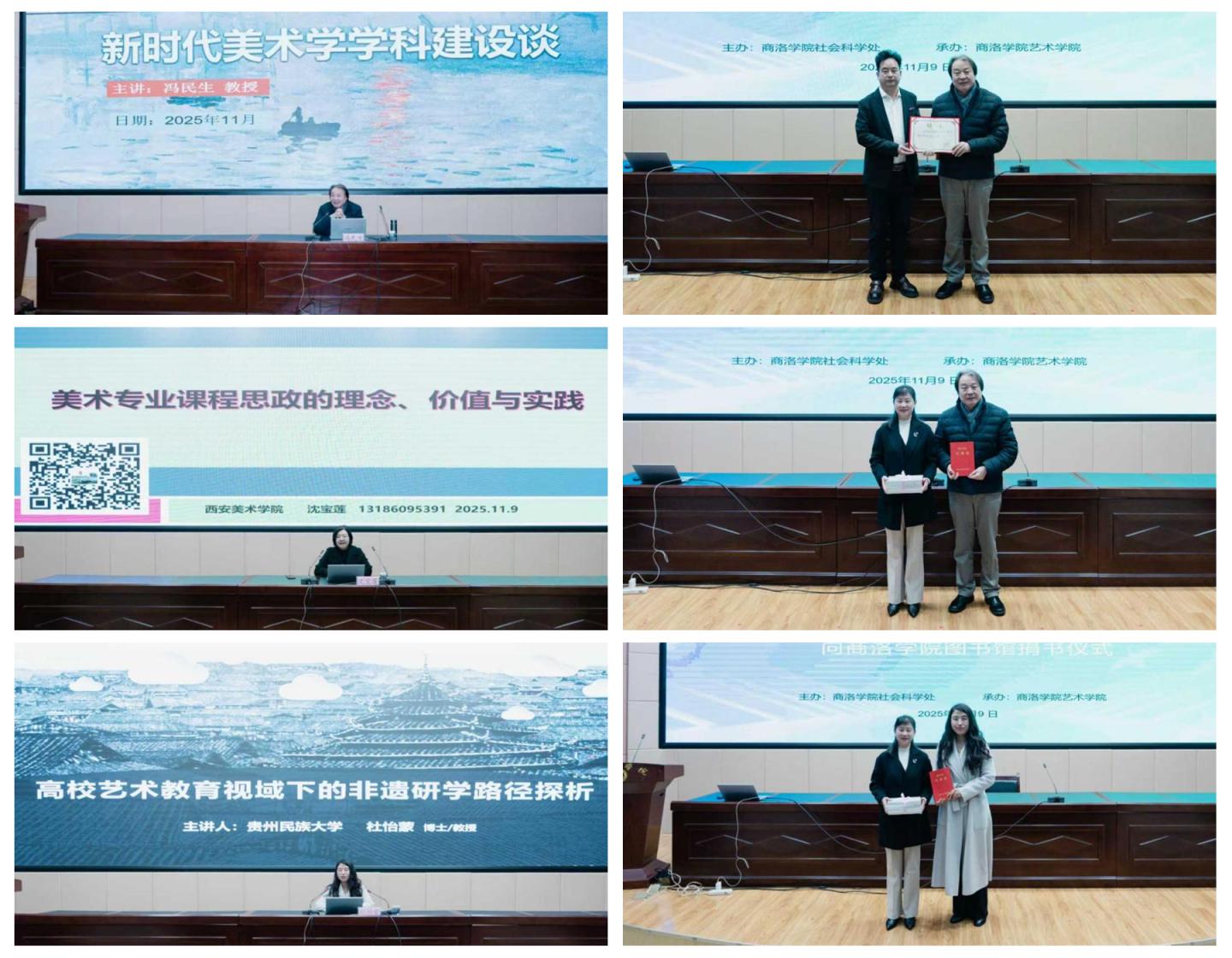 11月9日上午,由我校社科处主办、艺术学院承办的“秦岭学第一届美艺论坛”在图书馆二楼报告厅顺利举办,陕西师范大学美术学院博士生导师冯民生教授、西安美术学院马克思主义学院沈宝莲教授和贵州民族大学美术学院硕士生导师杜怡蒙教授应邀为本届论坛作专题学术报告,围绕秦岭地域文化内涵、秦岭画派创作研究、学科特色凝练、课程思政实施路径以及非遗传承创新等议题展开深入探讨。艺术学院相关负责人、全体教师及美术学专业学生300余人现场聆听了专家报告会。
