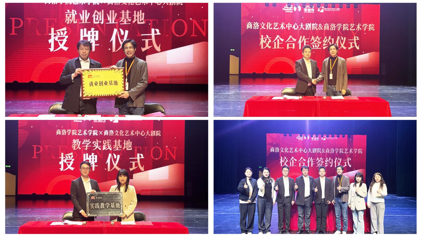 4月14日上午,艺术学院与商洛文化中心大剧院校企合作签约仪式在商洛文化中心大剧院举行,艺术学院院党委书记陈炜、院长唐曌堃、副院长刘志华、教学秘书莫飞、学工办主任杜璐以及冯渊副教授一行前往参加。仪式上,双方签订了实践教学基地、大学生就业创业基地校企合作协议,并围绕艺术实践教学、学生实习就业、区域文化活动共创等深入交流。